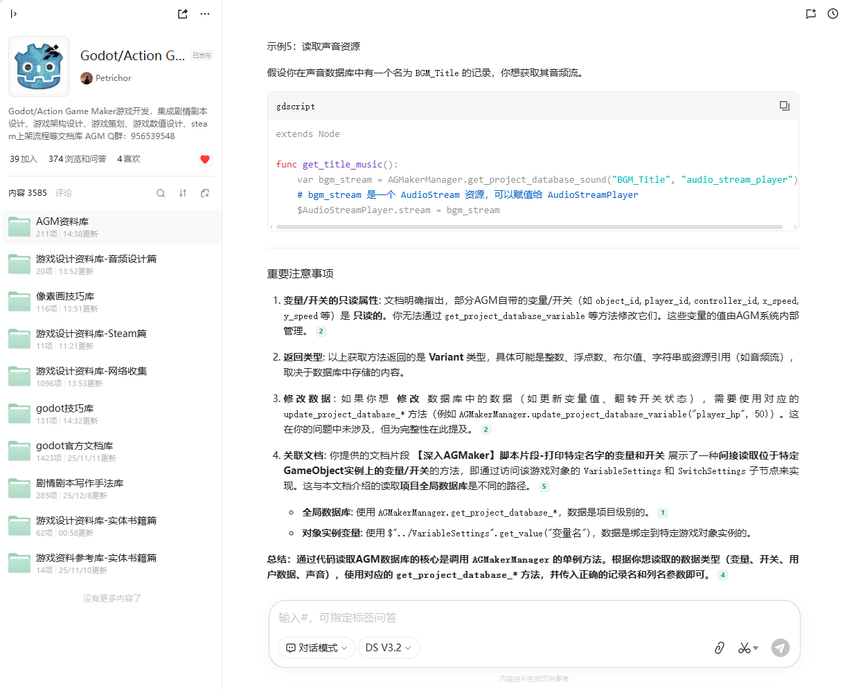 ・ 開発段階:AGMの具体的な機能の実装方法を提供し、AGMコード知識とGodotコード知識を組み合わせたコードセグメントを生成し、既知のエンジン技術的問題の解答を提供します。