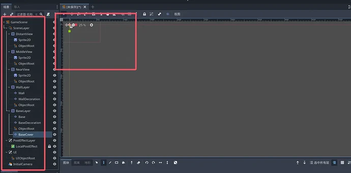 作成されたゲームシーンには、大量のものが一気に生成されます。左側はシーン全体で使用されるすべてのノード、右側はキャラクターを配置する場所です。【重要】ここで ctrl+S を押して保存してください。ファイル名と場所は任意です。