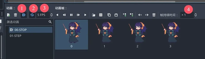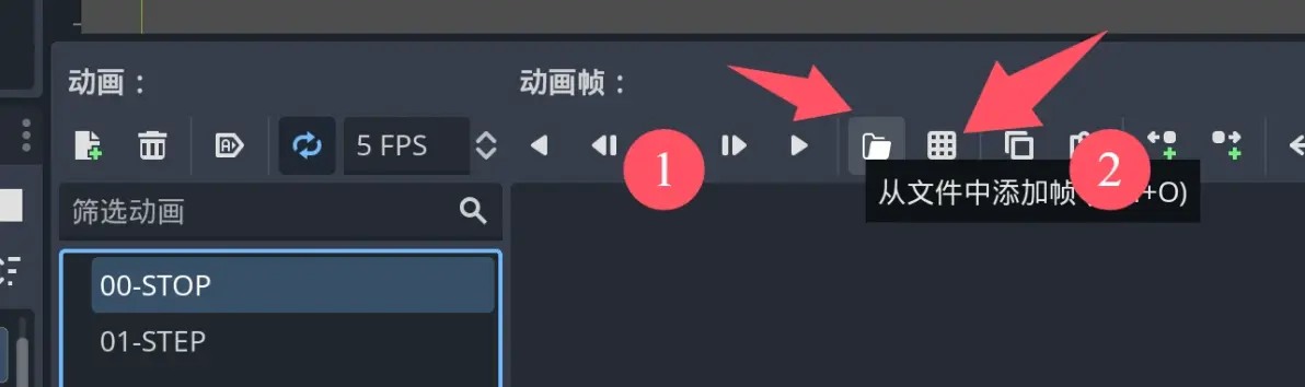 【00-STOP】を選択します。ここでは①ファイルからフレームを追加(各フレームが個別に保存されている場合)するか、②スプライトシートからフレームを追加(各フレームが 1 つのファイルに結合されている場合)するかを選択できます。効果は同じです。ここでは使用している画像を 2 つのアニメーションラベルに追加しました。