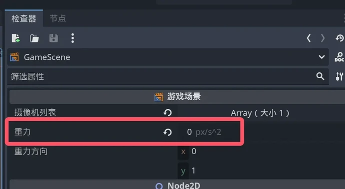 次に GameScene のインスペクターで、重力を 0 に設定します。
