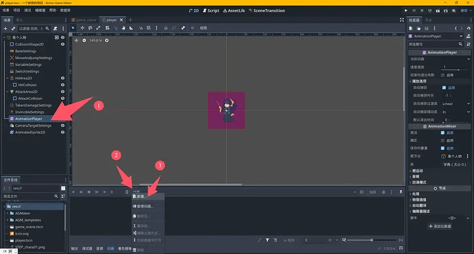まず AnimationPlayer を選択し、下部でアニメーションを選択してポップアップメニューを開き、「新規作成」を選択します。