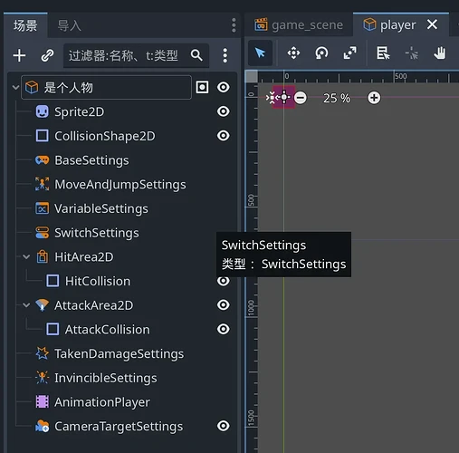 ここでは非標準的な手法を使用します。まず、「キャラクター」以下の Sprite2D ノードを削除します。