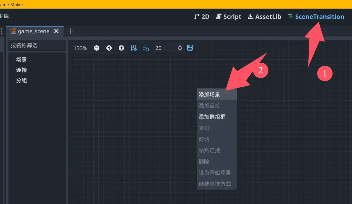 次に、シーンタブ①に切り替え、新しく作成したゲームシーンを読み込みます②。