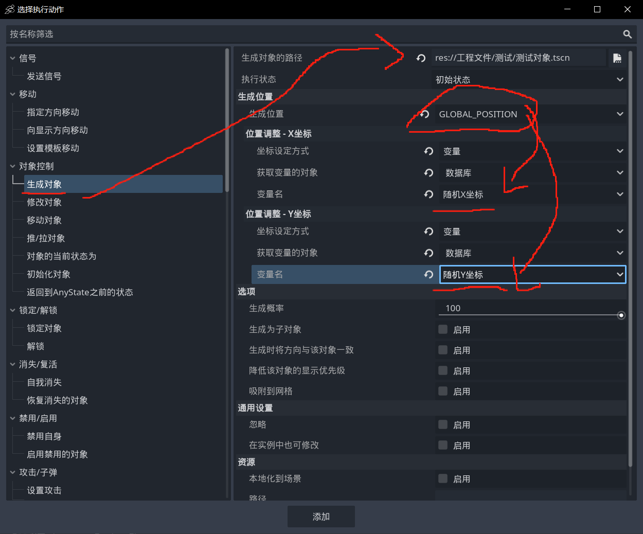 设定对象路径,生成位置为“GLOBAL_POSITION”,坐标为刚才生成的随机坐标变量
