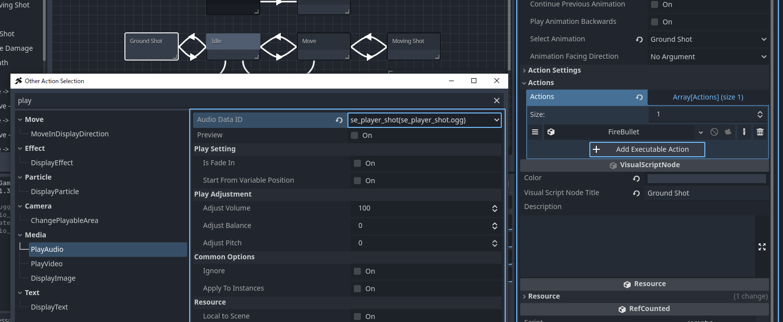 BGM and SE registered in the Sound Database can be played using the “PlayAudio” action in the visual script.