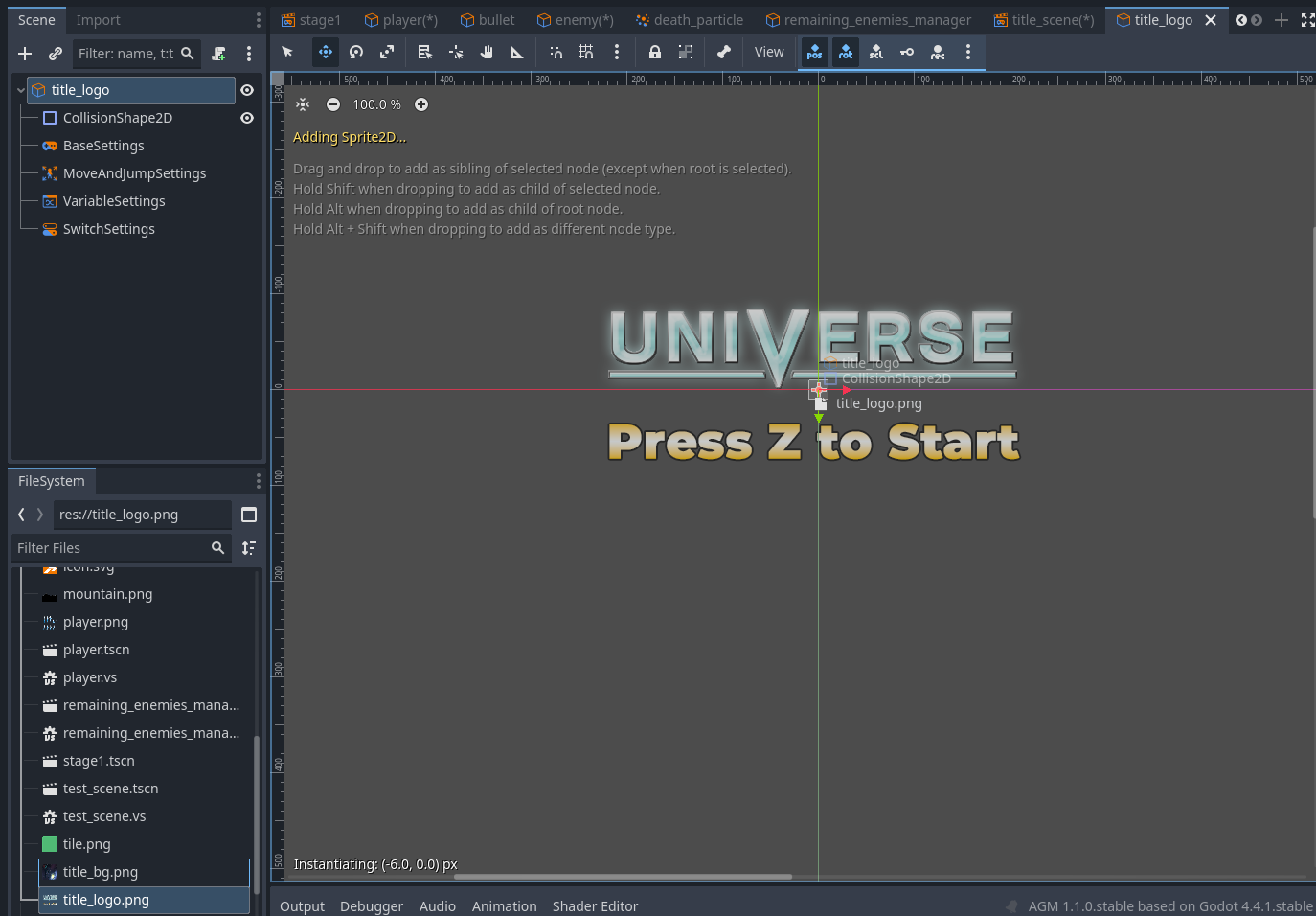 Drag title_logo.tscn from the FileSystem into the scene to place it.